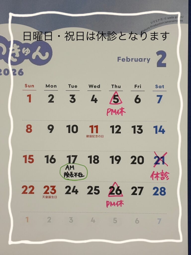 2/5・2/26 は、午後診療のみ休診です。